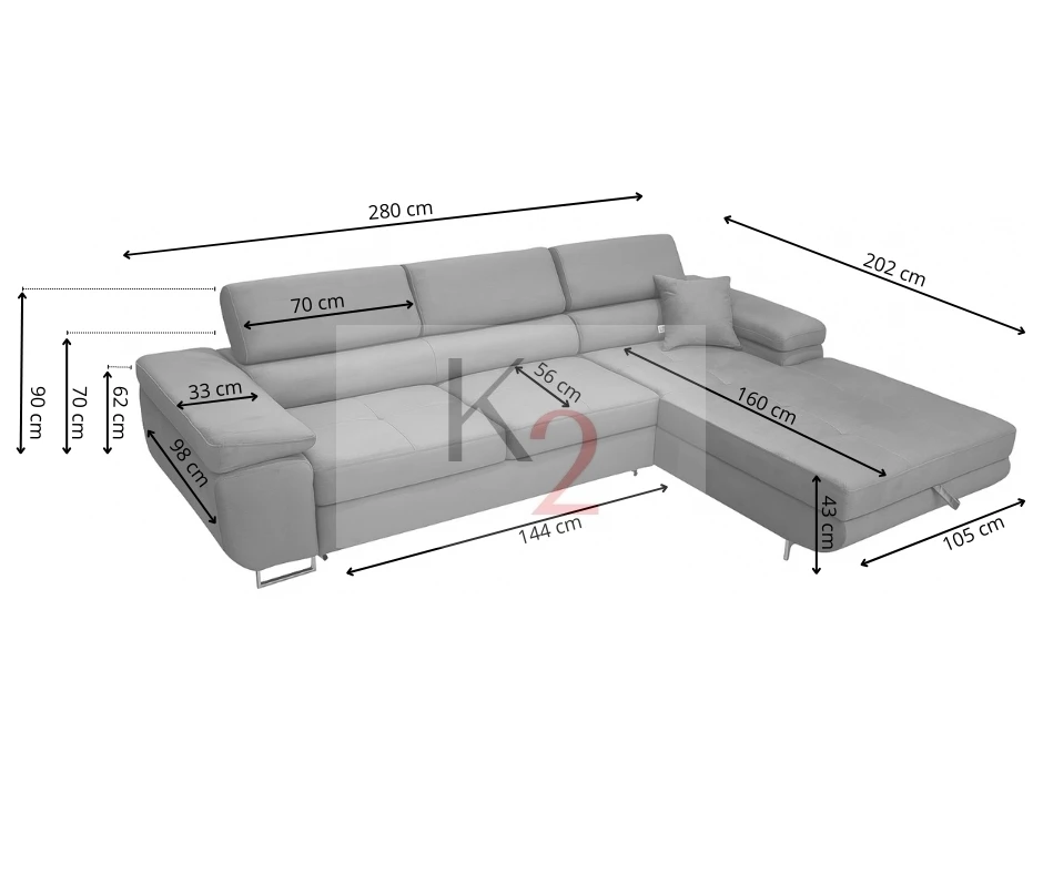 Narożnik ALEX do salonu jest komfortowym narożnikiem z trzema regulowanymi zagłówkami, które dopasujesz do swoich potrzeb dzięki wielostopniowej regulacji. Za wygodę i odpowiedni odpoczynek odpowiada pianka wysoko elastyczna T35 wraz ze sprężyną falistą, dzięki której pianka przez wiele lat zachowuje swój pierwotny kształt. Całość oparta jest na drewnianej konstrukcji gwarantującej stabilność podczas użytkowania. Oferowany model to zestawienie nowoczesnej formy z funkcjonalnością. Uroku dodają wysokie, stalowe nóżki, dzięki którym można w łatwy sposób posprzątać pod sofą.